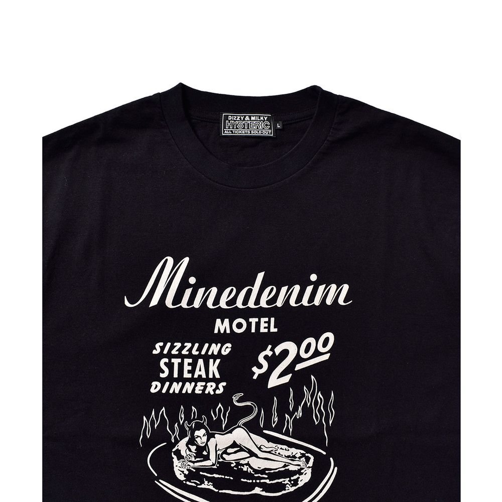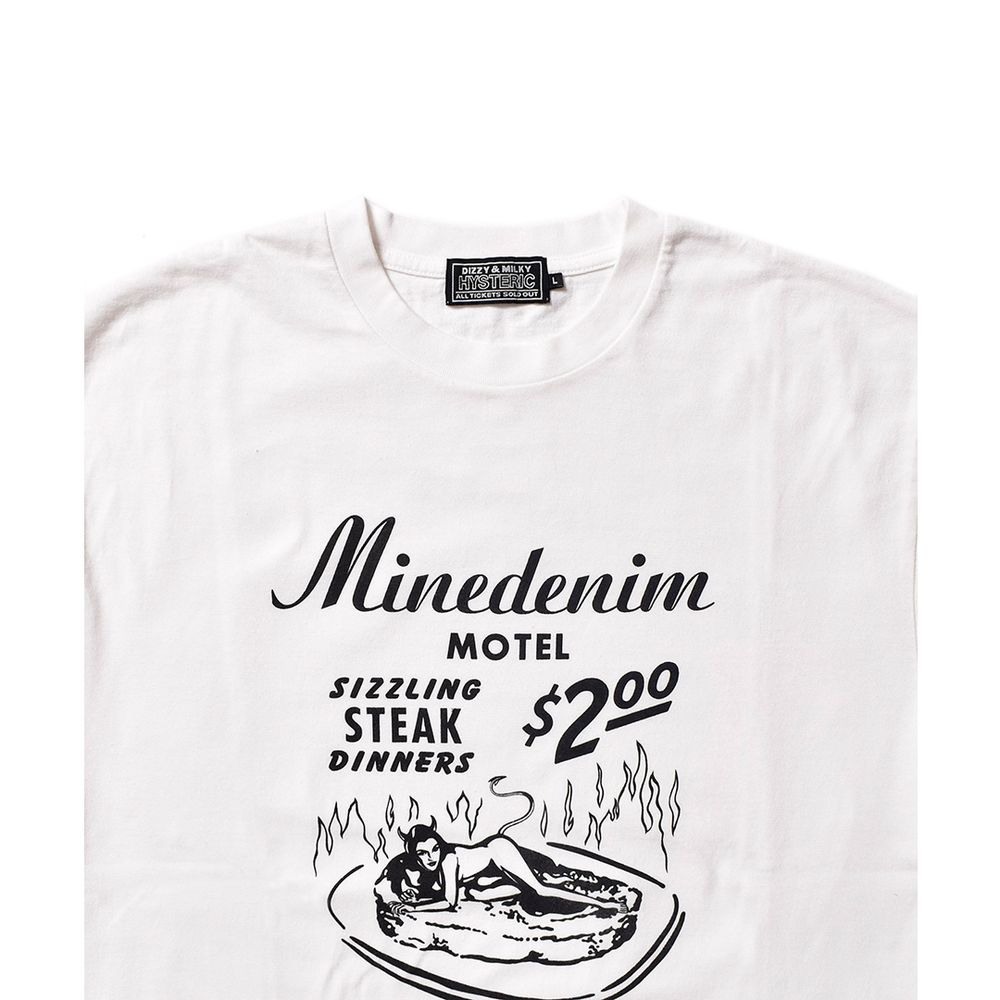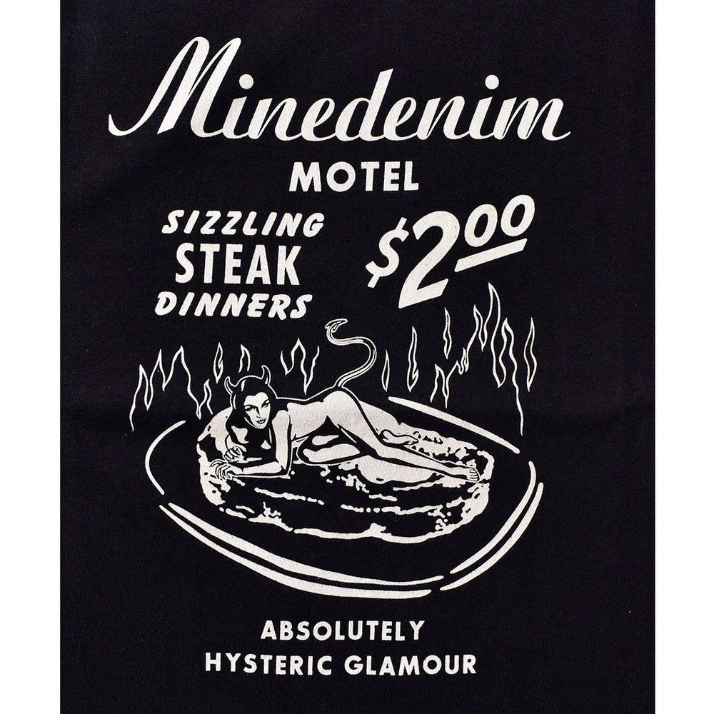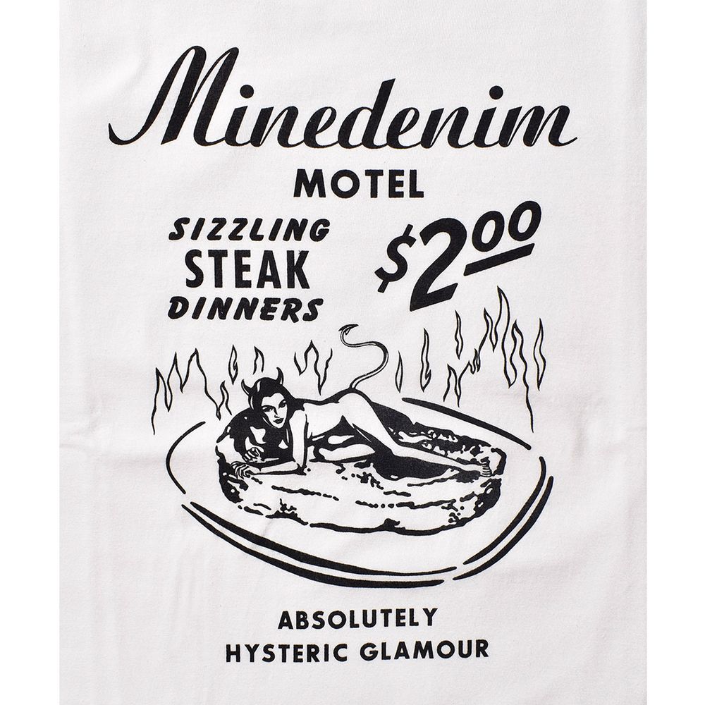 「Minedenim MOTEL」の看板メニューであるDevilステーキのグラフィックを落とし込んだTシャツは1960年代のマッチブックをイメージしたデザイン。