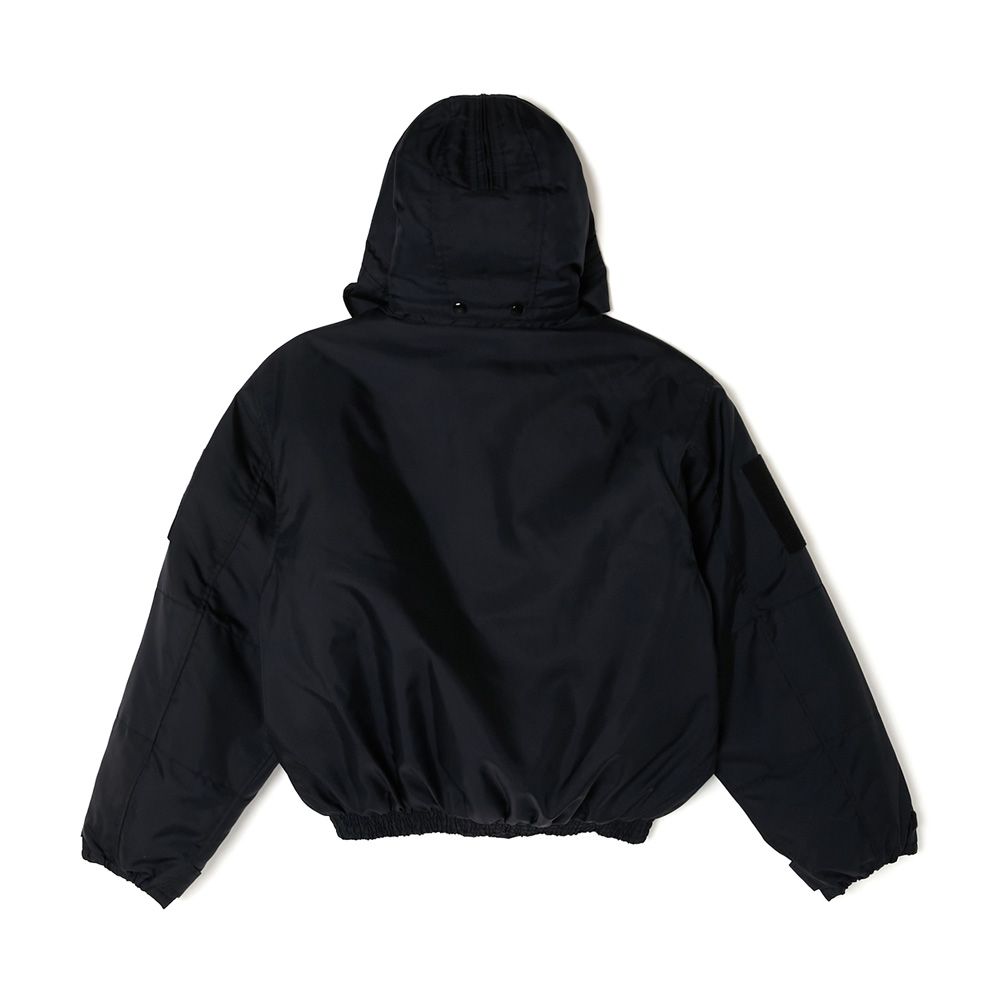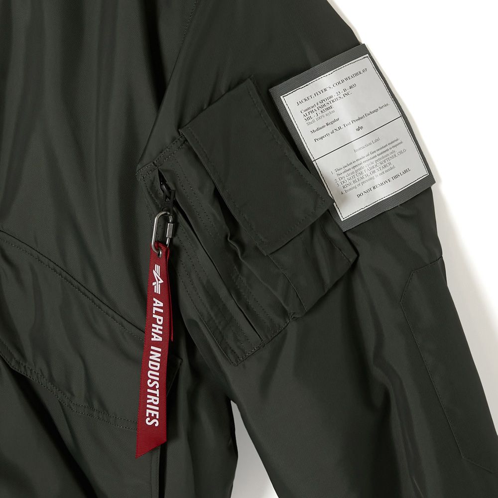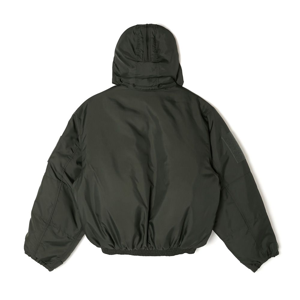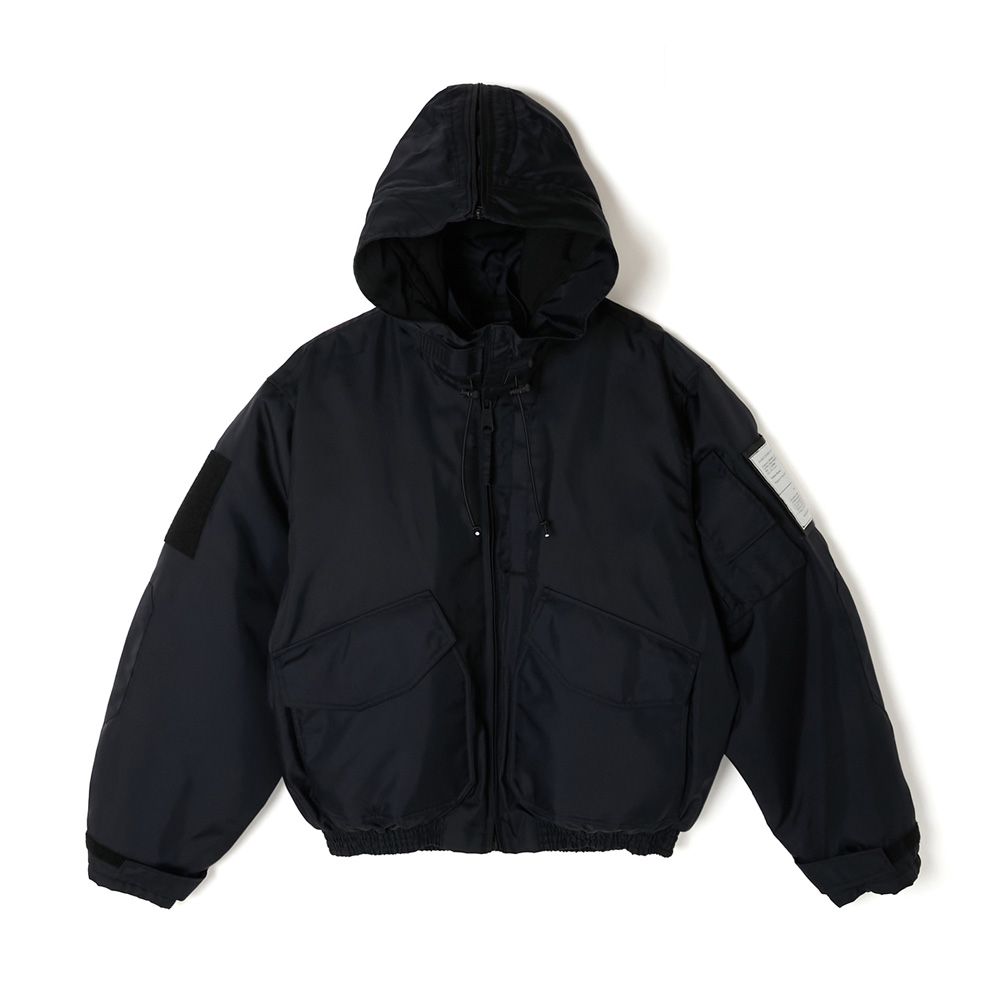 ベースには、ALPHA INDUSTRIESが配給したCWU-106/Pを採用。着脱可能なフルオープン仕様のフードは、80年代に登場したCWU-45/P用のオプションフードを使用し、大きめにデザインすることでボディとのバランスを調節。スピンドルにはナイロン素材を採用しモダンな印象に。裏地に中綿のキルティングを施し、袖先にタブを配置。フロントポケット内側にALPHA INDUSTRIESのタグをアタッチ。ベルクロ仕様のオリジナルミルスペックは両腕、または内ポケットに装着が可能。フードのタブと背面の2箇所にオリジナルミルスペックを配置。