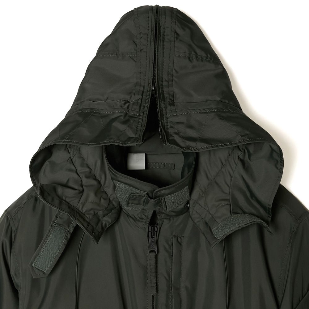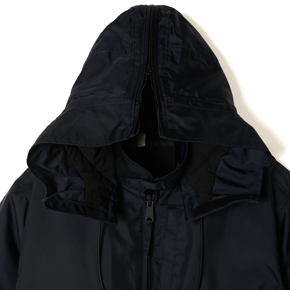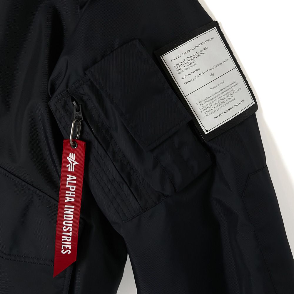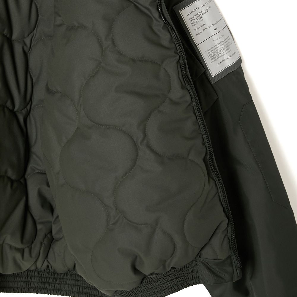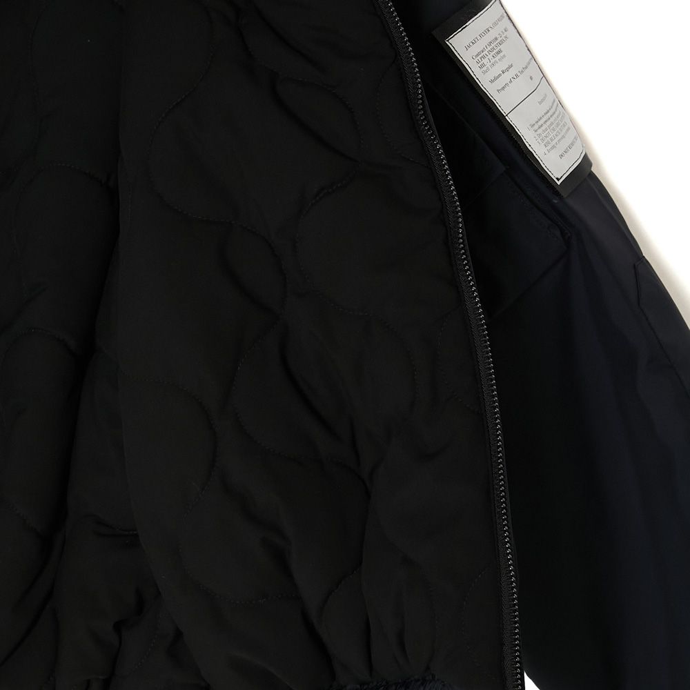ベースには、ALPHA INDUSTRIESが配給したCWU-106/Pを採用。着脱可能なフルオープン仕様のフードは、80年代に登場したCWU-45/P用のオプションフードを使用し、大きめにデザインすることでボディとのバランスを調節。スピンドルにはナイロン素材を採用しモダンな印象に。裏地に中綿のキルティングを施し、袖先にタブを配置。フロントポケット内側にALPHA INDUSTRIESのタグをアタッチ。ベルクロ仕様のオリジナルミルスペックは両腕、または内ポケットに装着が可能。フードのタブと背面の2箇所にオリジナルミルスペックを配置。