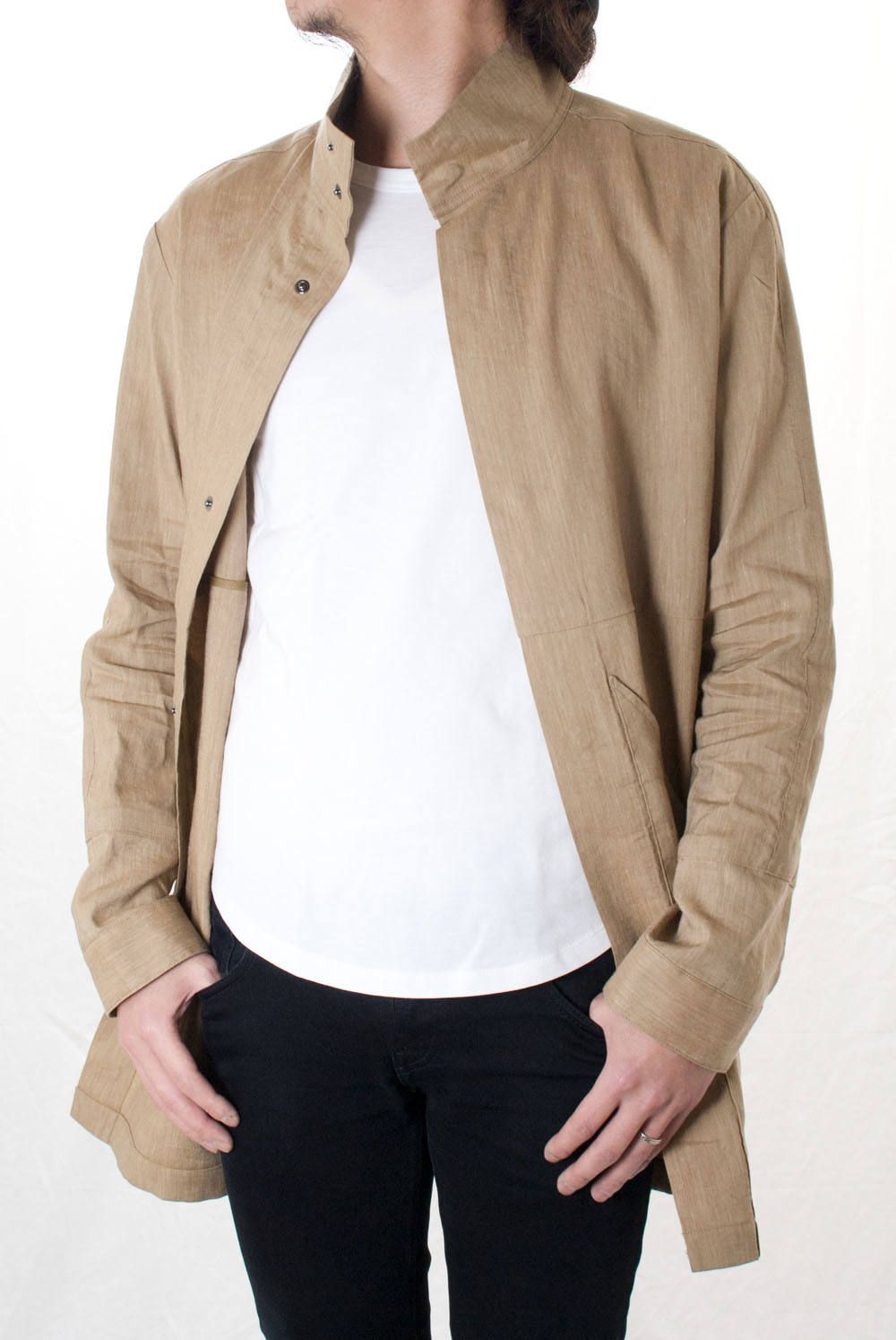 リネンの生地では難しいストレッチ感を持たせた"STAND COLLAR LONG WORK SHIRTS"