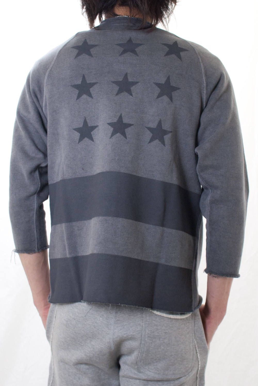 胸元、袖、裾のリブをカットオフし、製品染めを行い、経年変化を表現。