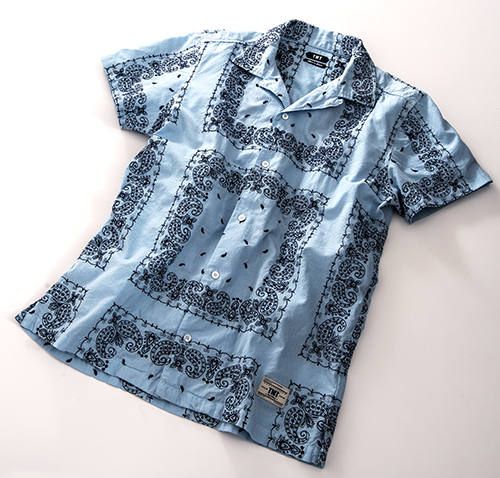 総柄のバンダナ刺繍が他にはない迫力の半袖開襟シャツ。製品染によるナチュラルな色と風合い、洗い加工による刺繍と生地との凹凸感が魅力の1枚。