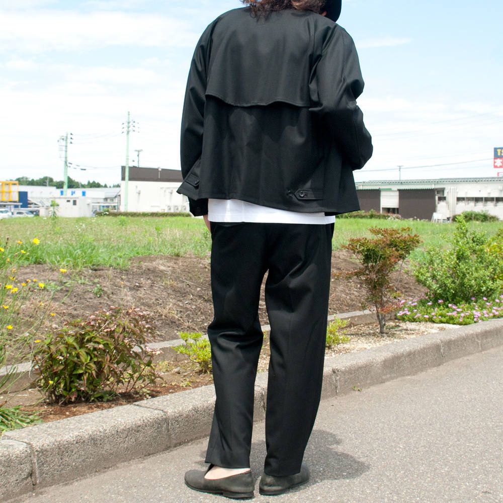 素材には、梳毛ウールのような表情を持ち、ピリングやシワになりにくく、扱いやすさが特徴のTRギャバストレッチを使用。