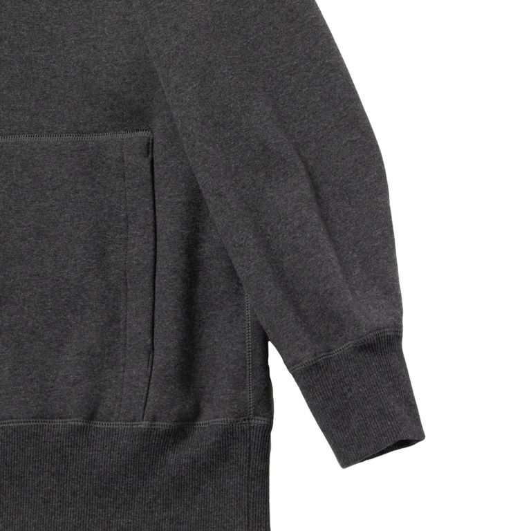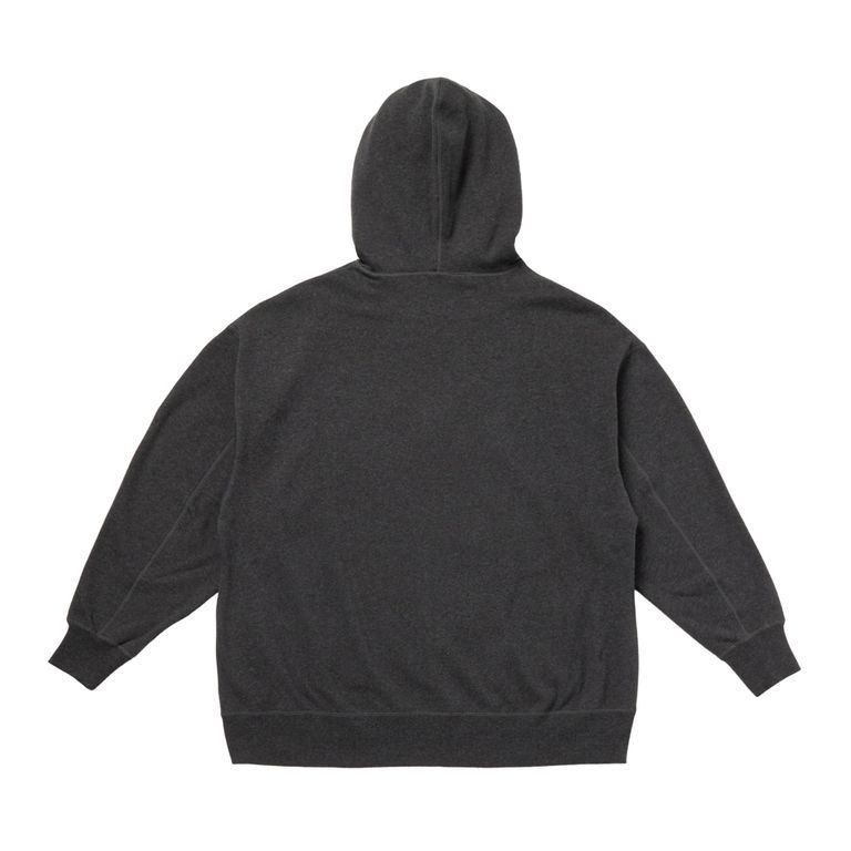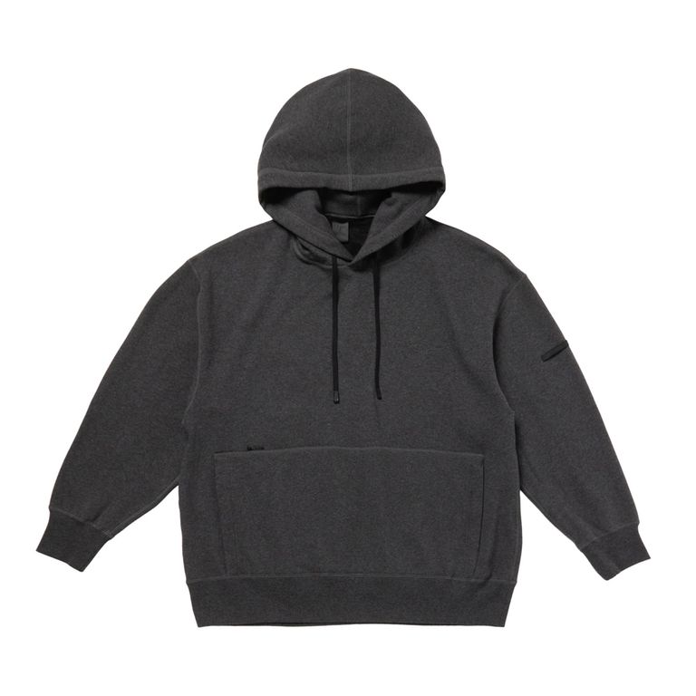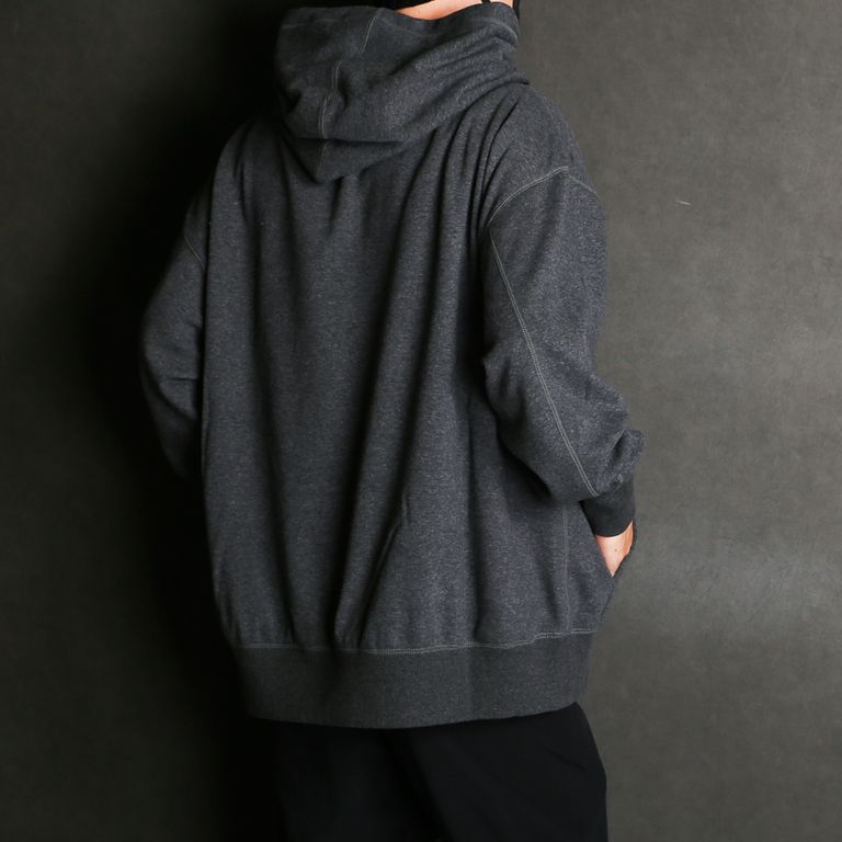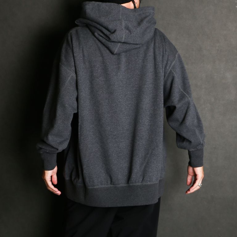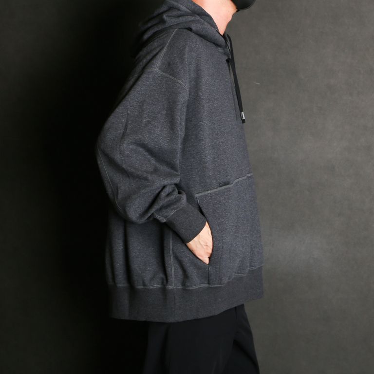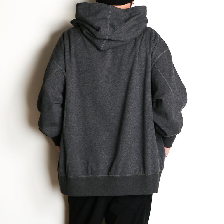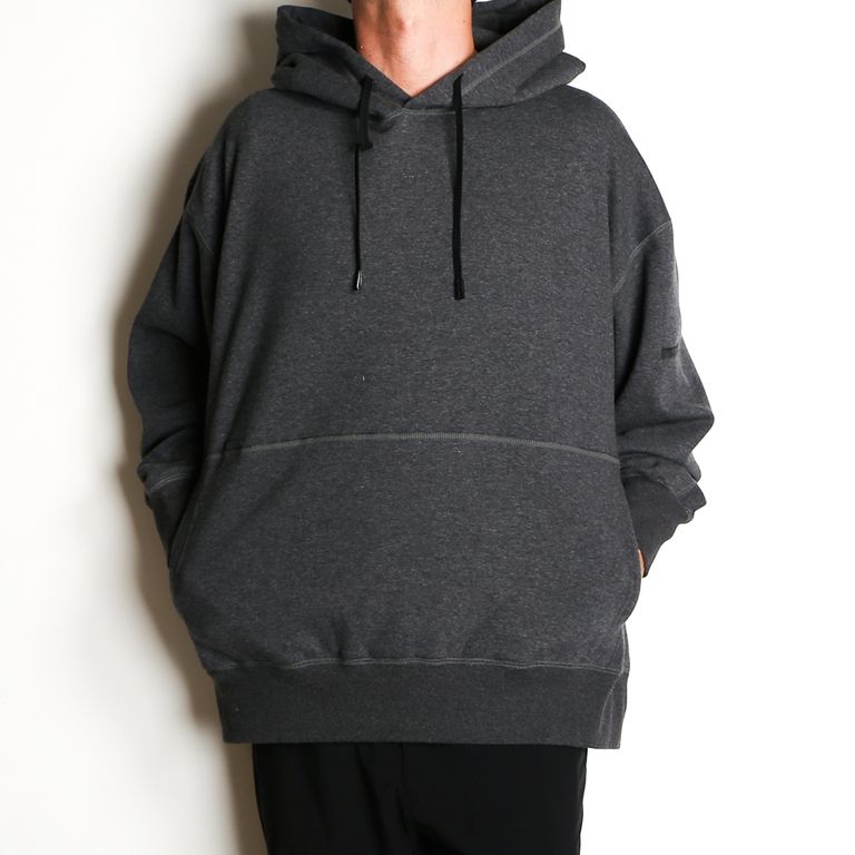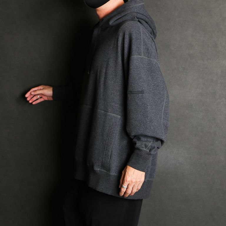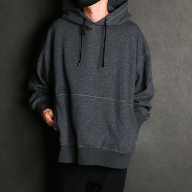 ・少し大きめのフード、フロントにはスクエアのカンガルーポケット付き。スリーブはジャケットやコート同様に2枚袖で仕上げることで立体的なボリュームを演出。先端にレザーを配したオリジナルのスピンドルを使用。ポケット、左袖にはN.HOOLYWOOD COMPILEのネームを配置。