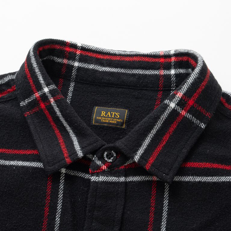 ポケット、脇下など各所の柄合わせを行う丁寧な仕上がりが特徴。胸元左右にフラップポケットを配置、左ポケット脇にピスネームを挟み込み。襟型はやや小ぶりでスリムに仕上げてある。前立て・袖口に使用したボタンは“RATS”・“WAY OF LIFE”の刻印入りオリジナルを採用、製品でワンウォッシュ済み。袖は剣ボロ仕立て、裾は緩やかなラウンドカット、レギュラーフィットシルエット。