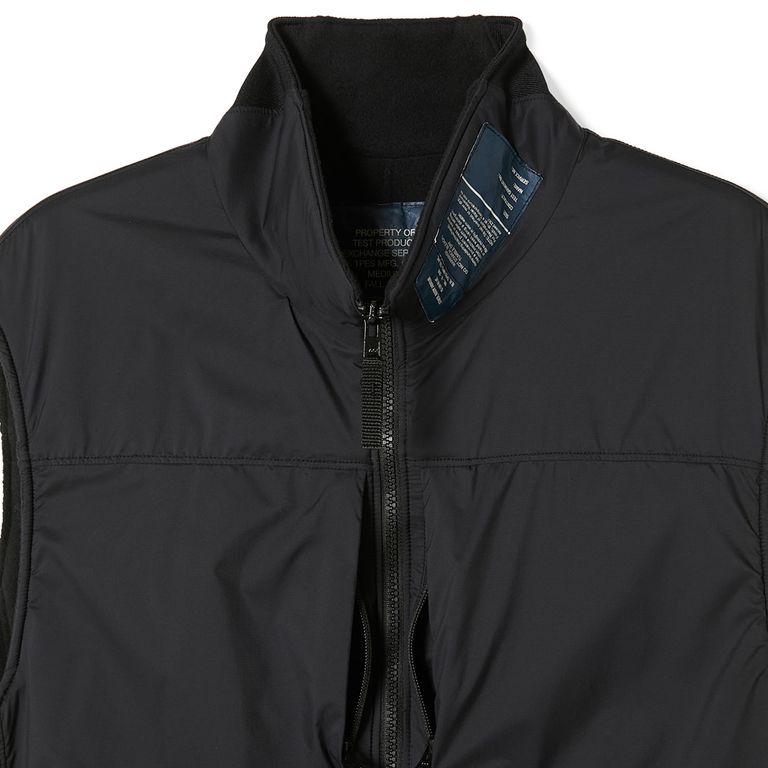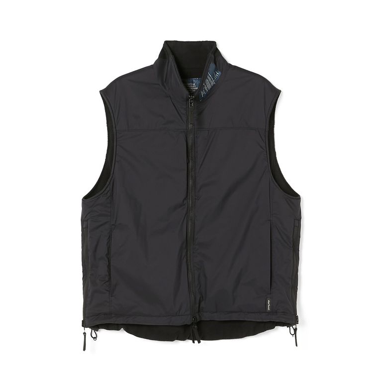 ・リバーシブル仕様。特徴的な襟元のリブは、ヘルメットの着脱を容易にするボディーアーマーのデザインを踏襲。水の侵入を防ぐため、肩に縫い目を設けず、前身頃から後身頃へと続く一体型のパターンを用いることで、水の侵入を軽減。フロントは逆開ファスナーを使用。両サイドのファスナー付きスリットは、拳銃の取り出しを想定したディテールを追加。ファスナー仕様のシームポケットの他、胸元にもポケットを完備。裾にはドローコードを配しフィット感を向上。首元にオリジナルミルスペック、フリース側の背面にはサイズスペックを配置。
