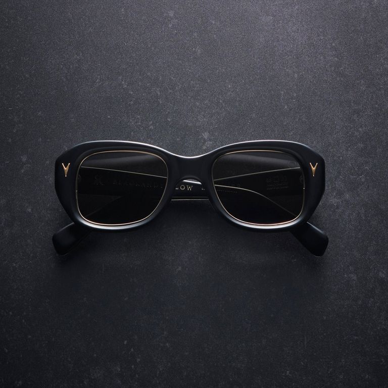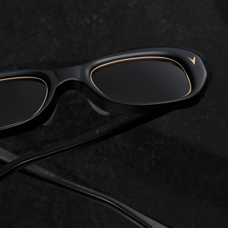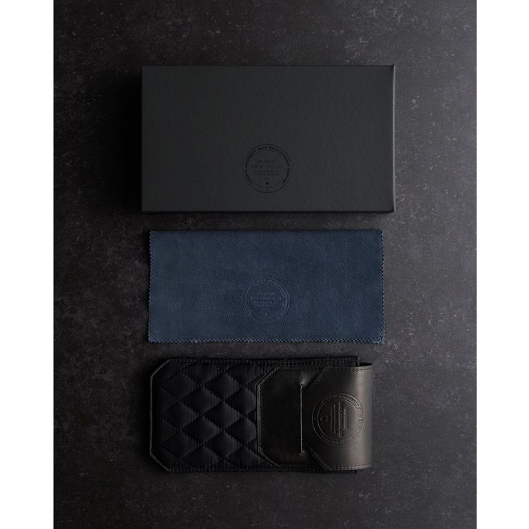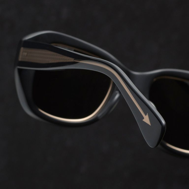 8mm厚のアセテート素材を使用したテレビジョンカットのオリジナルサングラス。フロントデザインは、1960年代のフレンチヴィンテージに見られるレンズが窪んだ仕様となっており、レンズ部分内周にメタルリムを配置させた高難易度の仕様は正に職人泣かせと言える。テンプルのスケルトン部分に見えるメタル芯の柄も、職人が手彫りのテクニックを駆使し鼠の毛並みのモチーフを表現している。また、内側と外側で異なるカラーを抱き合わせたことによりテンプルの柄をより一層主張している。フロント両サイドのカシメ飾りはテンプルエンドとリンクする様に矢尻の形を採用。テンプルの内側にはモデル名・シリアルナンバー・“HANDCRAFTED IN JAPAN”のレーザー箔押しプリント。日本国内でも希少となった最高峰の技術を誇るファクトリーで熟練の職人達が丁寧に手掛けた至高のクリエイション。