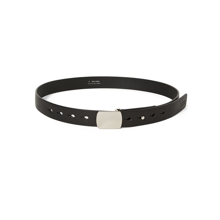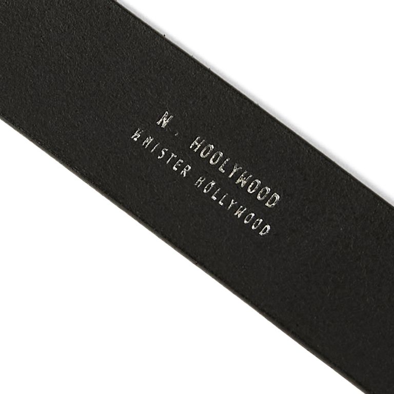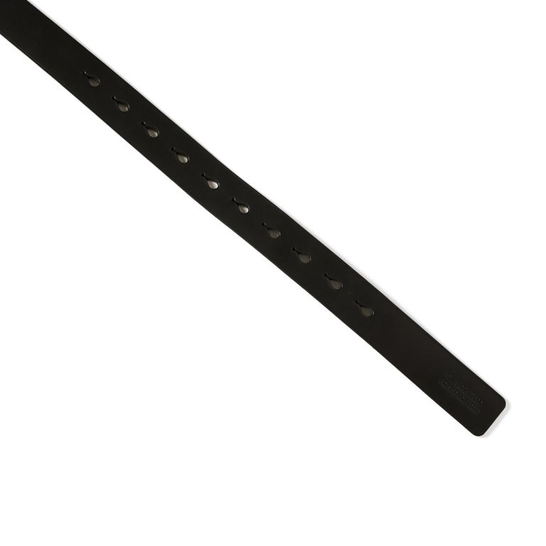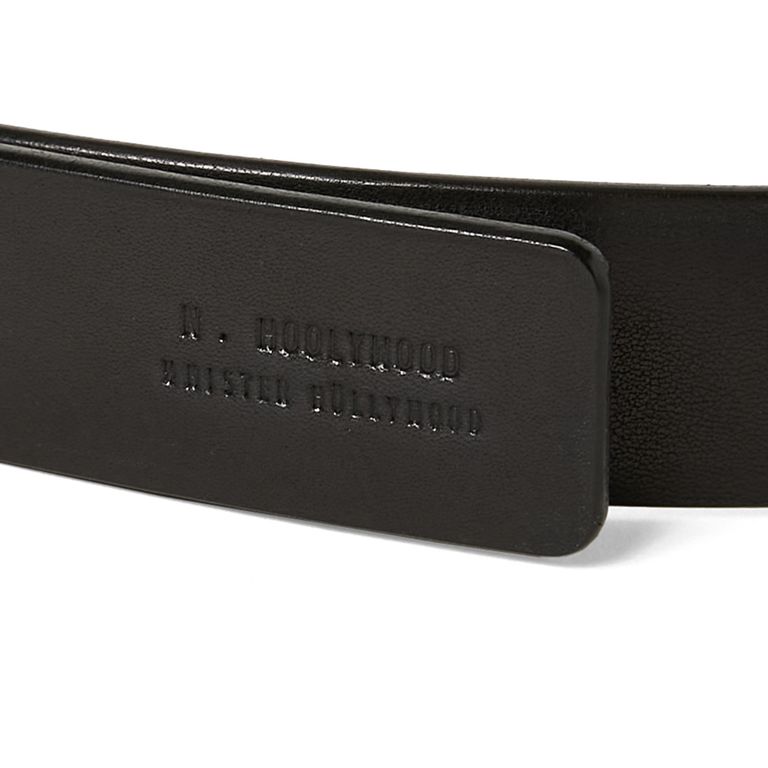 ・バックルはライダースジャケットのベルトから着想得たオリジナルデザイン。背面にシルバーの箔押し、剣先には素押しでロゴを配置。端はコバ塗り仕上げ。