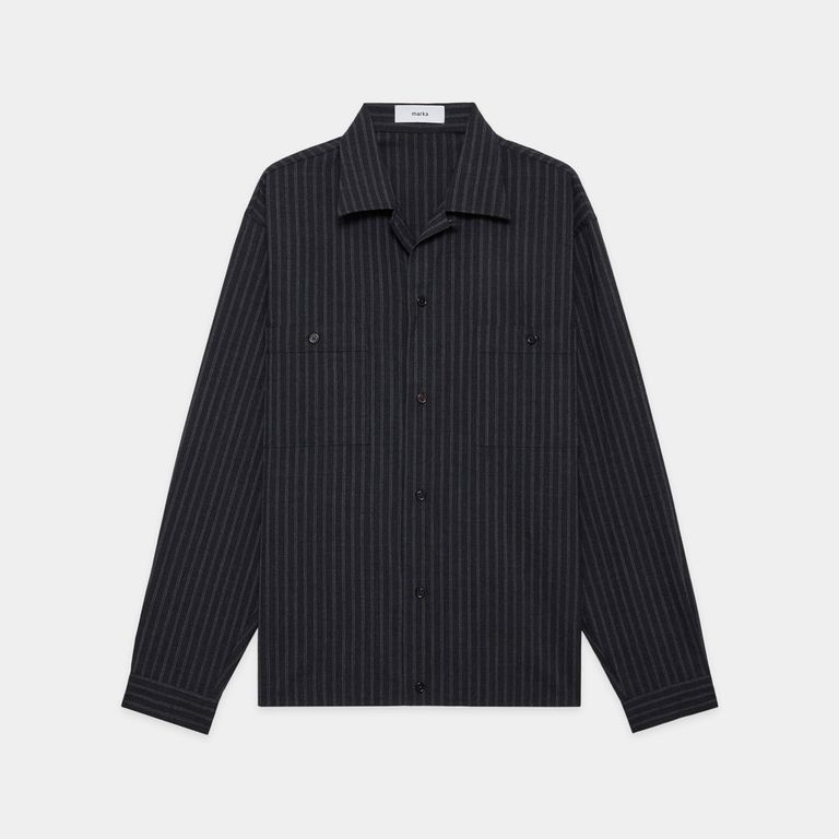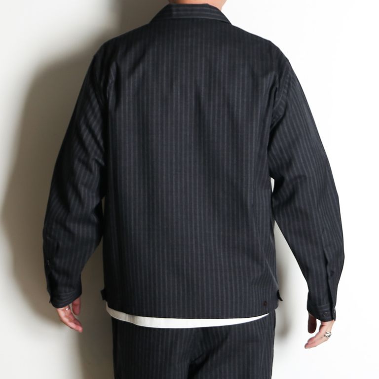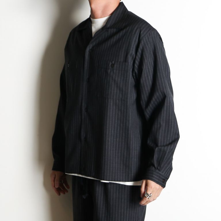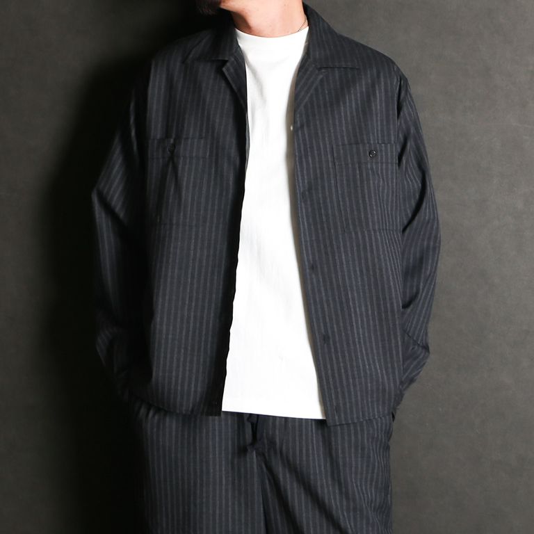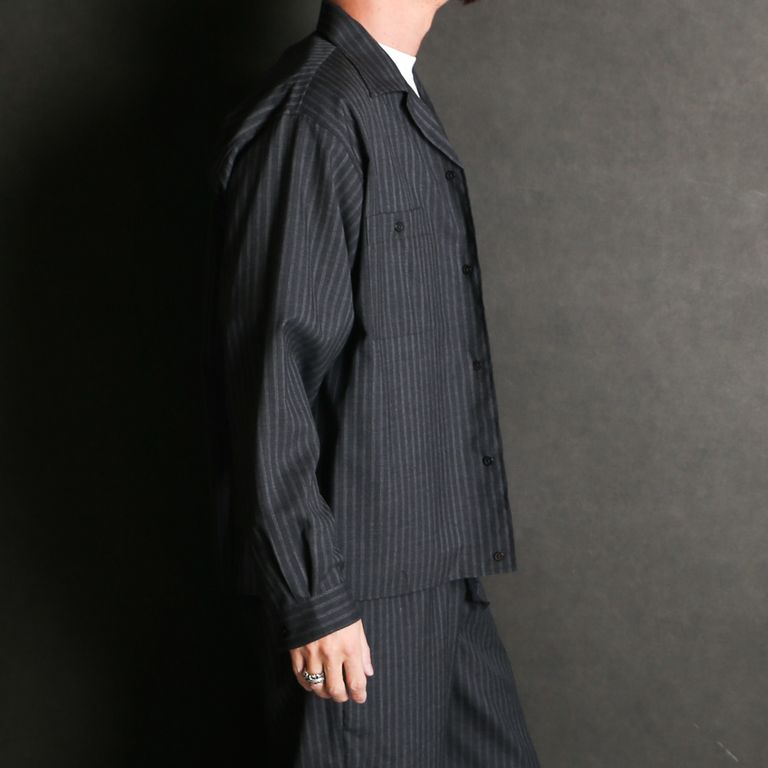 【ラスト1点-サイズ2】DOUBLE POCKET OPEN COLLAR SHIRT - GRAY STRIPE / 2/72 ウールトロピカルワッシャー - ダブルポケット オープンカラーシャツ / M26A11SH01C