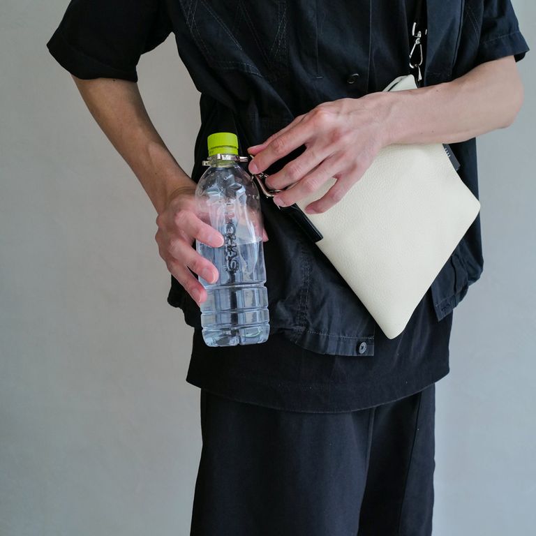 長さ調整可能なナイロンのショルダーストラップにはオリジナルの金具をプラス。裏地にはオリジナルのブラックストライプ生地を採用。また、ペットボトルが取り付け可能なホルダーを装備した機能的な作りです。内装にもファスナー付きのインナーポケットを配置することで、小物をしっかり小分けにすることができます。